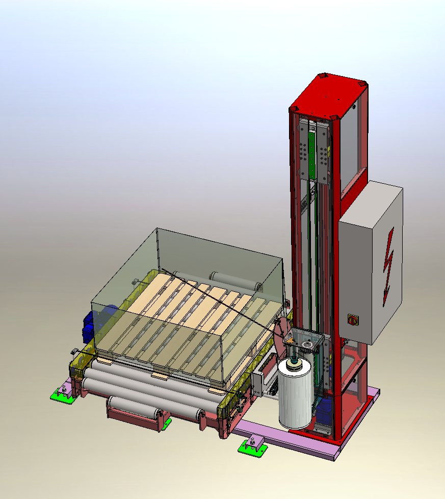 - Automatická ovinovačka palet s válečkovou dráhou zahrnující automatické odtržení ovinovací folie.